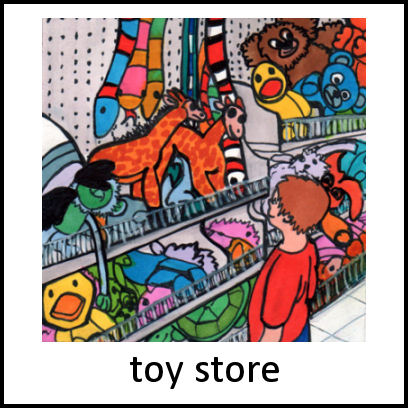 Things found in and around a toy store, which is a retail shop that specializes in the selling of games and toys.